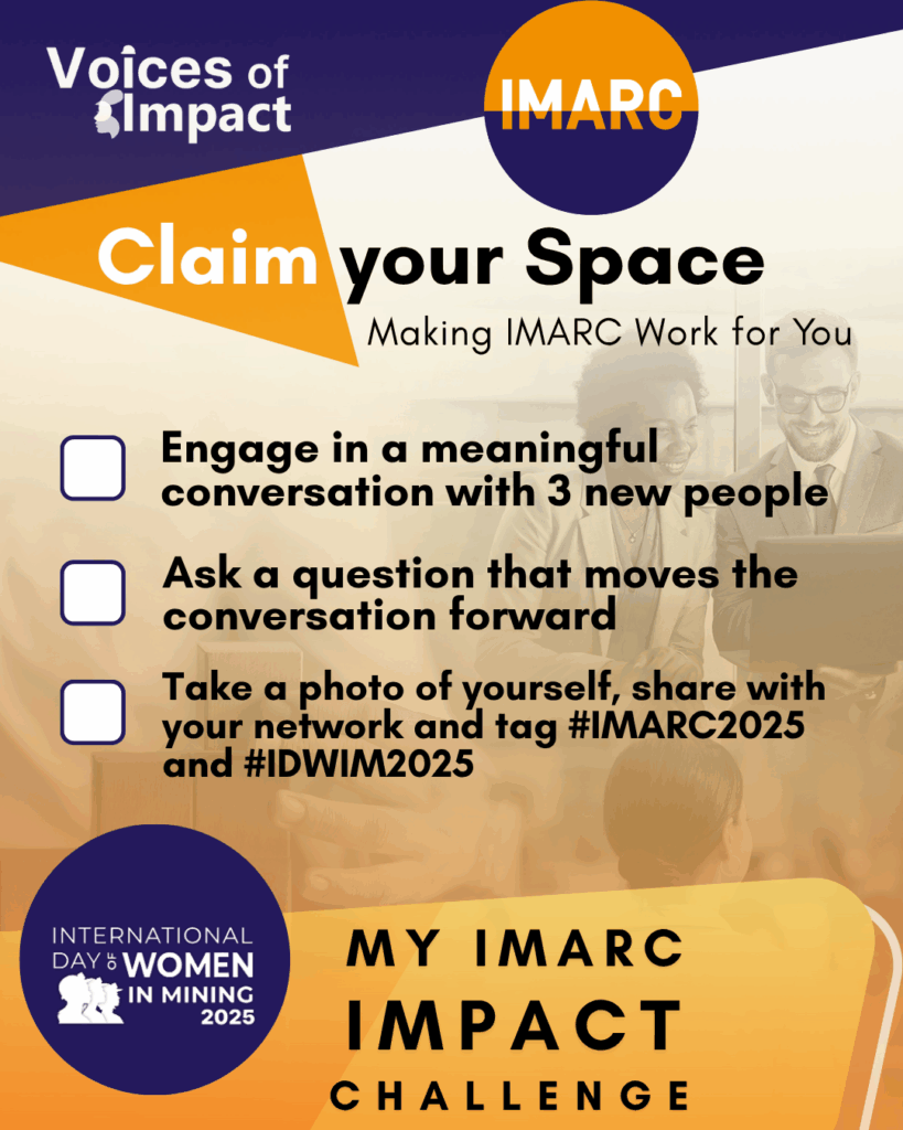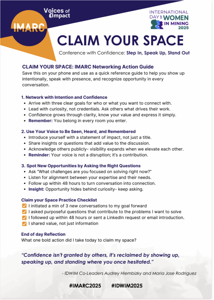 This 30-minute kickoff hosted by International Day of Women in Mining (IDWIM) Co-leaders Audrey Hlembizky and Maria Jose Rodriguez is designed to warm you up with confidence and prepare you to win for IMARC success.